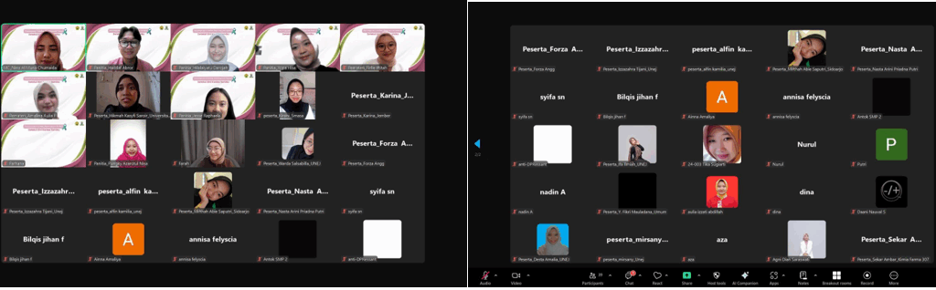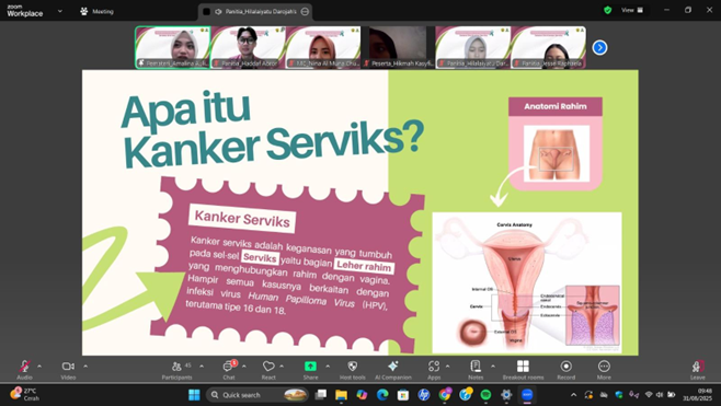 Para pemateri menjelaskan bahwa kanker serviks merupakan penyakit ganas yang menyerang leher rahim. Penyakit ini umumnya disebabkan oleh infeksi virus Human Papilloma Virus (HPV), khususnya tipe 16 dan 18. Deteksi dini dianggap sangat penting agar kanker dapat dicegah atau ditangani sejak awal, sehingga risiko kematian dapat ditekan. Materi juga dilengkapi dengan penjelasan anatomi rahim sehingga peserta lebih mudah memahami. Webinar berlangsung interaktif dengan diskusi antara peserta dan narasumber. Diskusi ini memberikan ruang bagi peserta untuk memperoleh pengetahuan baru sekaligus menambah kesadaran akan pentingnya menjaga kesehatan reproduksi.
