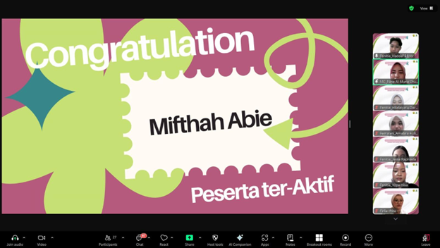 Sebagai bentuk apresiasi, panitia memberikan penghargaan kepada peserta teraktif. Gelar tersebut diraih oleh Miftah Abie yang dinilai paling aktif berpartisipasi selama acara. Hal ini diharapkan menjadi motivasi bagi peserta lain untuk terus berani bertanya dan berbagi pengalaman dalam kegiatan edukasi kesehatan. Acara ditutup dengan foto bersama seluruh panitia, narasumber, dan peserta. Melalui kegiatan ini, Farmasi UNEJ berharap masyarakat, khususnya perempuan, semakin peduli terhadap deteksi dini kanker serviks. Edukasi kesehatan semacam ini menjadi langkah nyata untuk menekan angka kasus kanker serviks di Indonesia.