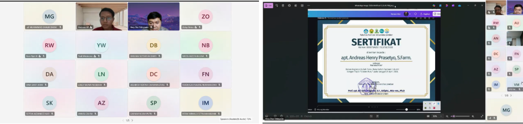 Fakultas Farmasi Universitas Jember (UNEJ) menyelenggarakan kuliah tamu pada mata kuliah Farmasi Industri dengan mengangkat topik Sistem Mutu. Kegiatan ini dilaksanakan pada Sabtu, 25 April 2026 secara daring melalui platform Microsoft Teams. Kuliah tamu ini menghadirkan narasumber praktisi industri, yaitu apt. Andreas Henry Prasetyo, S.Farm., yang menjabat sebagai Assistant Quality System Manager di PT Kimia Farma Tbk. Kegiatan ini bertujuan untuk memberikan pemahaman kepada mahasiswa dalam memetakan regulasi, memahami keterkaitan antar regulasi, serta merespons berbagai kasus yang dapat ditemui di industri farmasi.