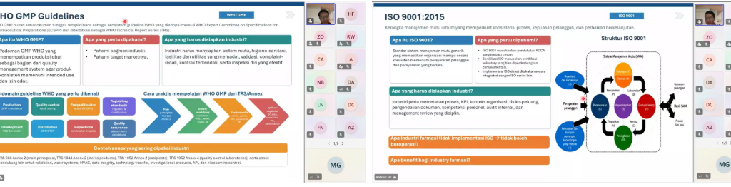 Dalam pemaparannya, narasumber menjelaskan konsep dasar sistem mutu serta pentingnya penerapan manajemen mutu dalam industri farmasi. Manajemen mutu didefinisikan sebagai totalitas pengaturan yang dirancang untuk memastikan bahwa produk obat memiliki mutu yang sesuai dengan tujuan penggunaannya. Selain itu, dijelaskan pula berbagai sistem manajemen mutu yang umum digunakan di industri, seperti Total Quality Management (TQM), Six Sigma, Quality Management System (QMS), dan Good Documentation Practices.